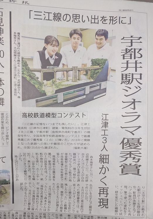 全国高等学校鉄道模型コンテストで、江津工業の3人が作った旧三江線の宇都井駅の模型を作り、全国から120点の応募から、最優秀賞に次ぐ優秀賞に輝いた。と。