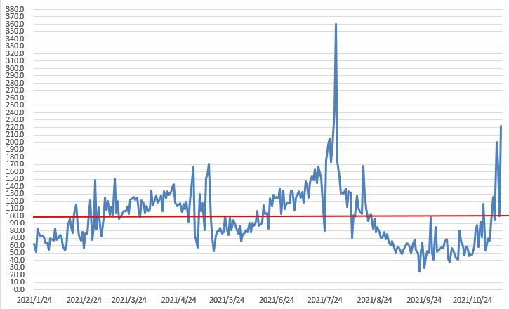 ここ数日、赤い線より上に出てきており、増加傾向に変わったと感じられます。