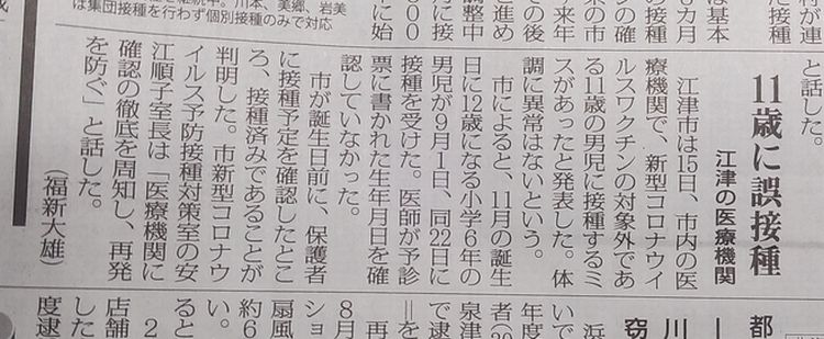 江津市で、11歳の子どもにワクチン接種を行う不祥事があった様です。