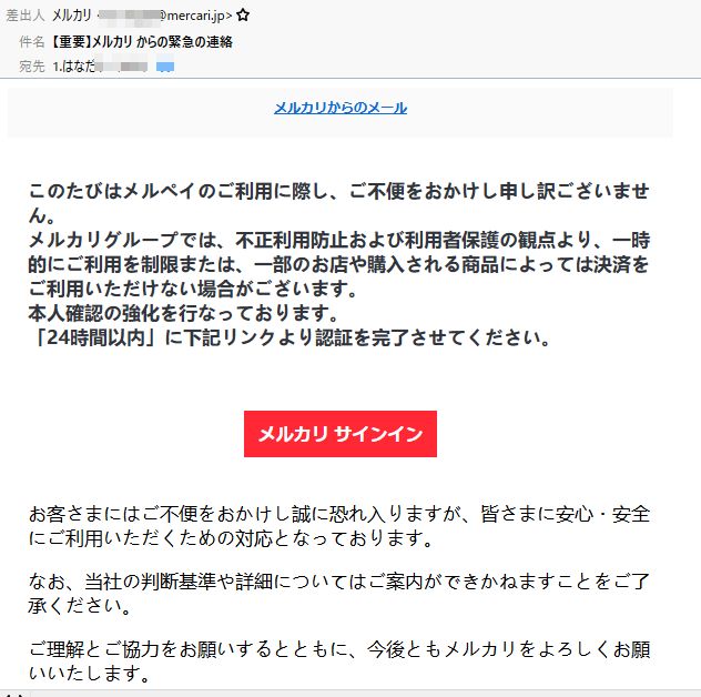 上記は、メルカリの会員宛てを装ったものです。