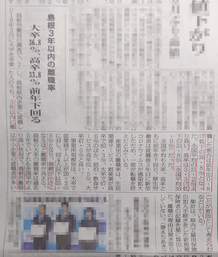 島根県の新卒入社3年以内の離職率が、前年度を下回った様です。