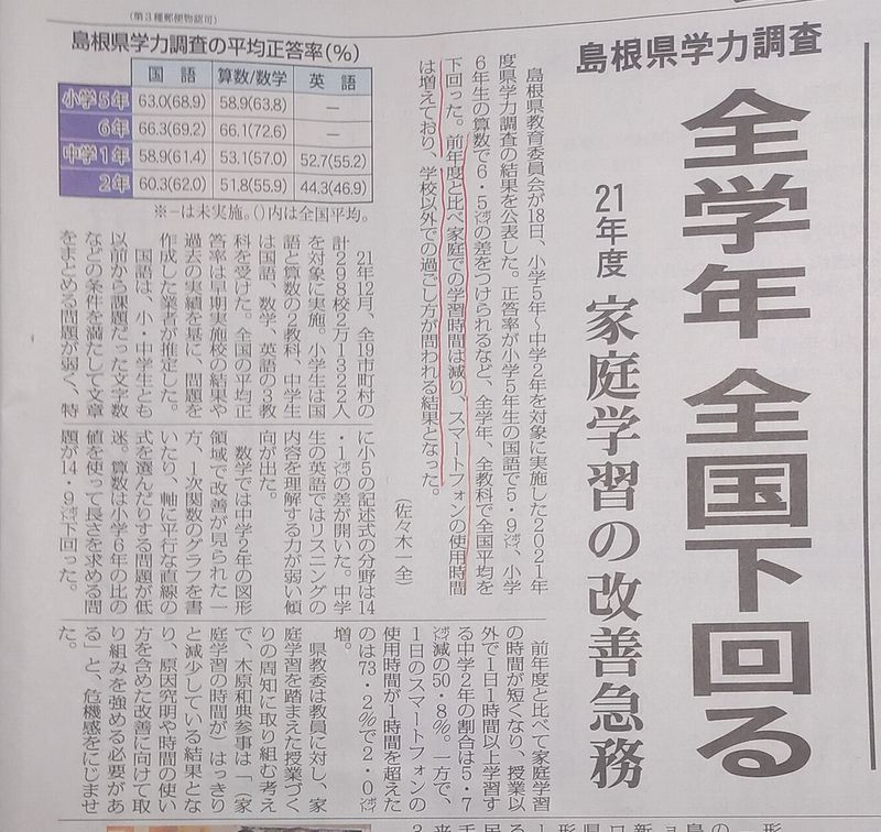 島根県の小中学校の学力調査の結果、今年も全国平均を下回り、その原因は家庭学習の時間が減少している事と結論づけた様です。