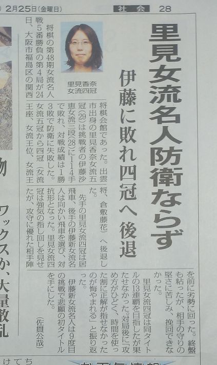 里見さんが女流名人の防衛に失敗し、5冠から4冠に後退した。と。