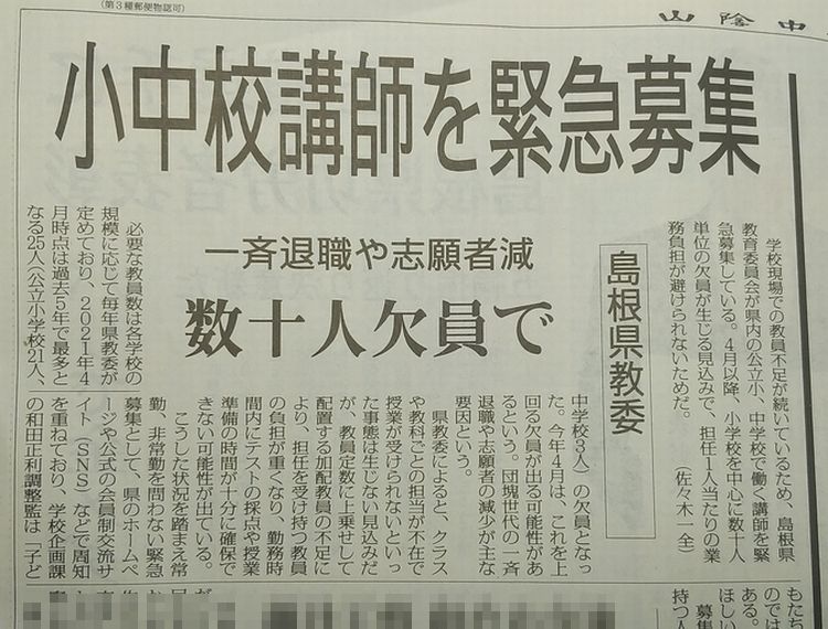 小中校の教員の欠員が出ていて、講師を緊急募集する。と。