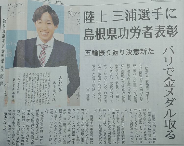 東京オリンピックで活躍した、お隣浜田市出身の順天堂大学の三浦選手に島根県功労者表彰が行われた。と。