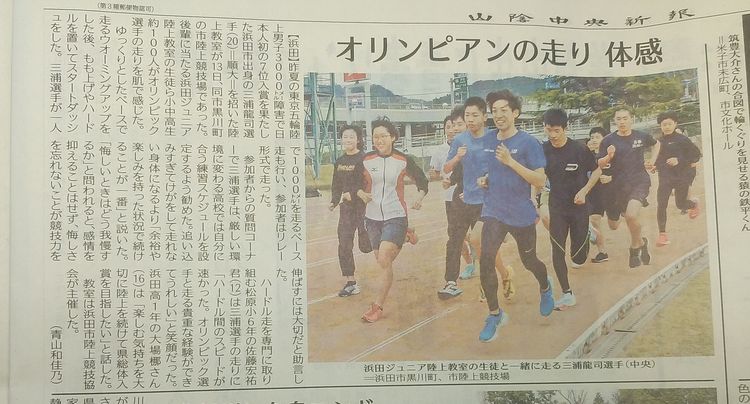 先日も、陸上の順天堂大学の三浦選手の島根県功労者表彰の話題を取り上げましたが、今日は、浜田市の自身も参加していた浜田ジュニア陸上教室に参加したとのニュースです。