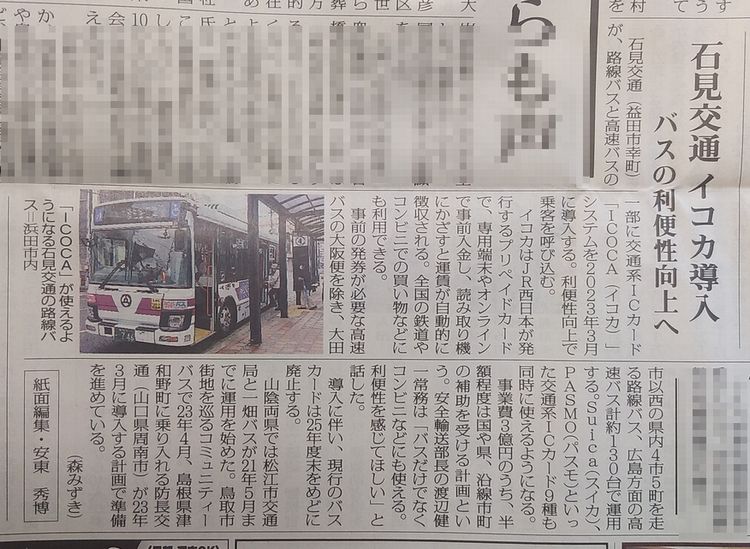 2023年3月にこの辺りを運行している石見交通バスで「ICOCA」が使用可能となる。と。