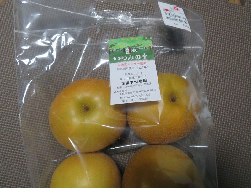 今日、浜田市の金城町方面に出かけたついでに、直売センター的な所を訪問した所、”豊水”と書いた梨を発見。初めて知った品種です。