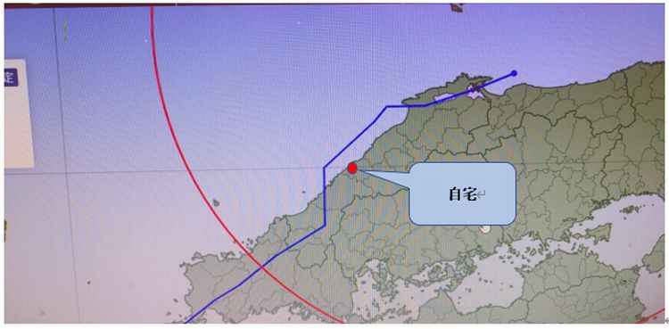 気象庁のHPの台風14号の移動経緯を見ると、青いラインが移動奇跡で、私の住んでいるのは、赤マークです。