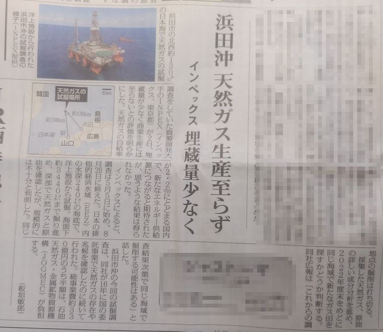 浜田沖の天然ガス埋蔵量調査で、「商業生産には至らない。」との評価がされた。と。