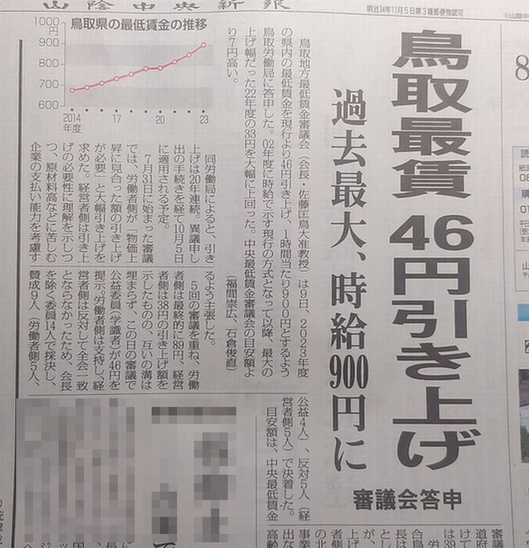 何と、お隣鳥取県が、最低賃金を46円引き上げ、900円にする。と。