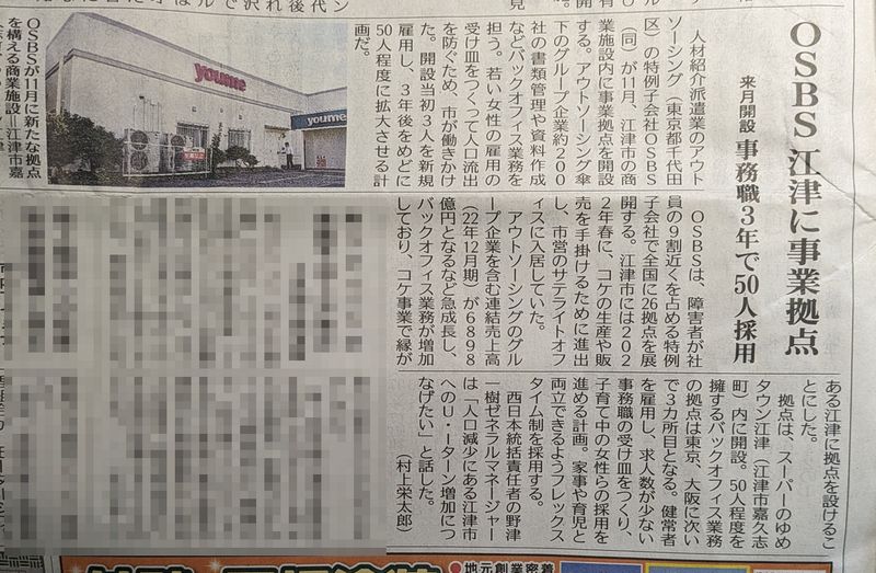 人材紹介派遣業のアウトソーシングの特例子会社OSBSが江津市に事業拠点を開設する。と。
