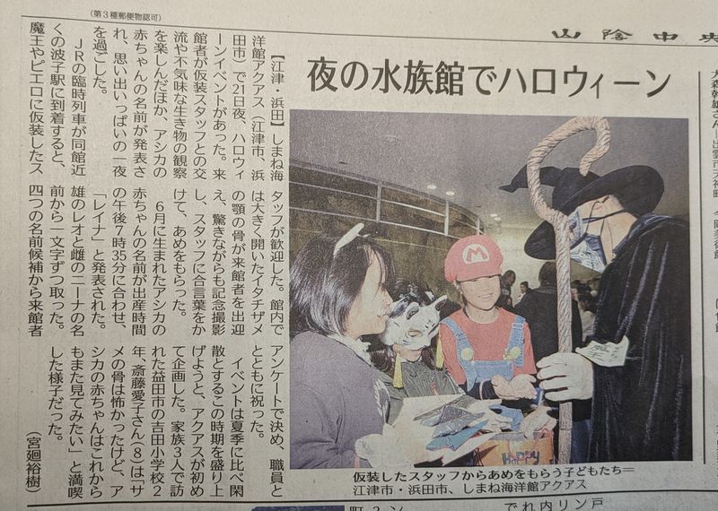 上記、新聞記事では、シロイルカのパフォーマンスで人気のアクアス水族館でも、夜のハロウィーンが開催された様です。