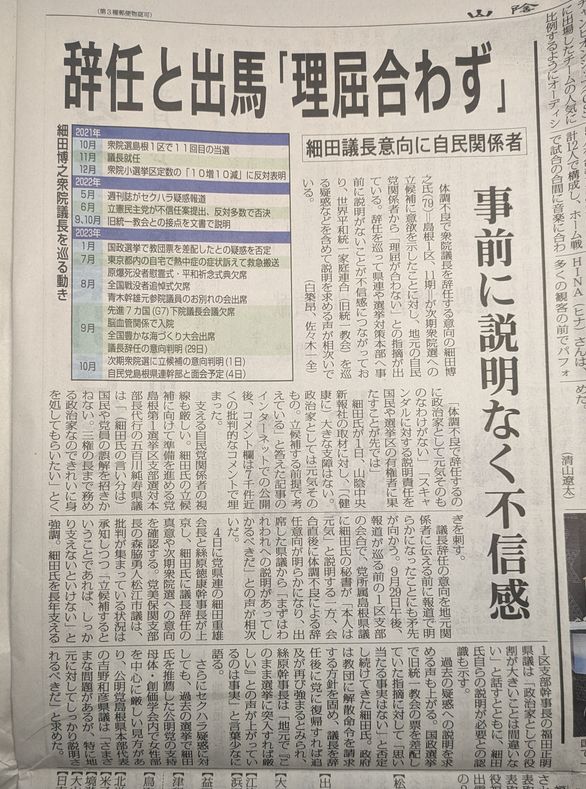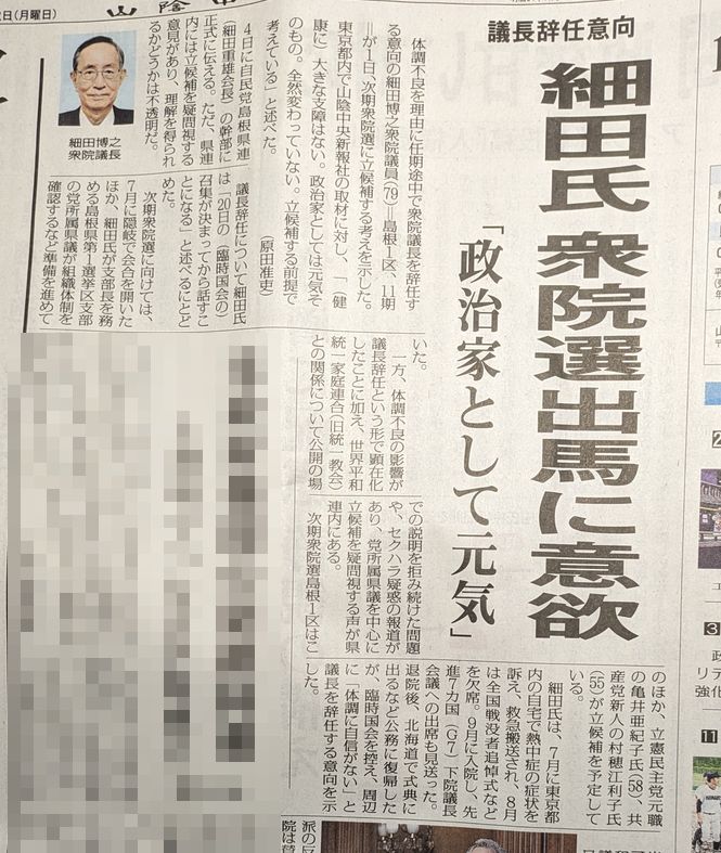 体調不良を理由に任期途中で衆院議長を辞任する意向と報じられた細田博之衆院議員が、地元紙の「山陰中央新報社」の取材に対し、次期衆院選について「(健康に)大きな支障はない。政治家としては元気そのもの。全然変わっていない。立候補する前提で考えている」と語った。と。