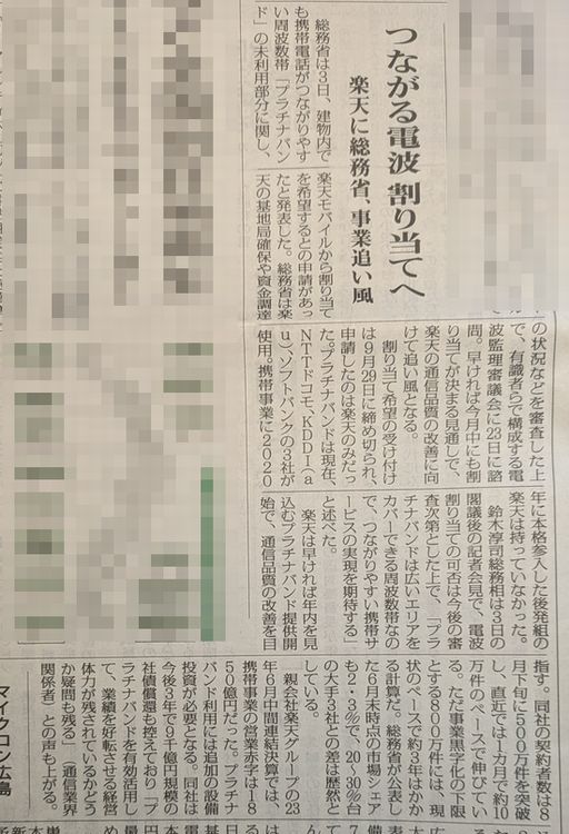 「楽天は繋がりにくい」との話を聞いて、調べてみると、最も繋がりやすい700MHzから900MHzの周波数帯が、楽天に割り当てられていない様で、今回やっと、空き周波数の割り当て募集があり、楽天のみが手を挙げ、ほぼ割り当てが決定する見込み。と。