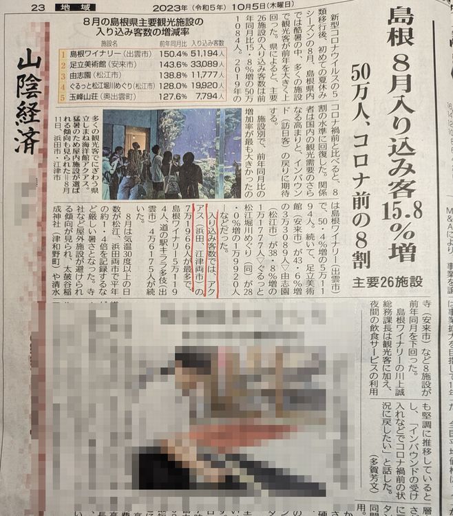 今朝の新聞によると、島根県の8月の各所の入込客が、15.8%増加した様です。