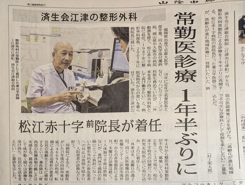 済生会江津病院に、常勤の整形外科医が着任した。と。