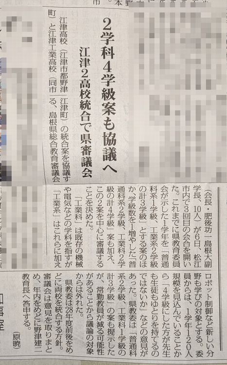 以前、報告した江津高校と江津工業高校の統合の件で、県の審議会があった様です。