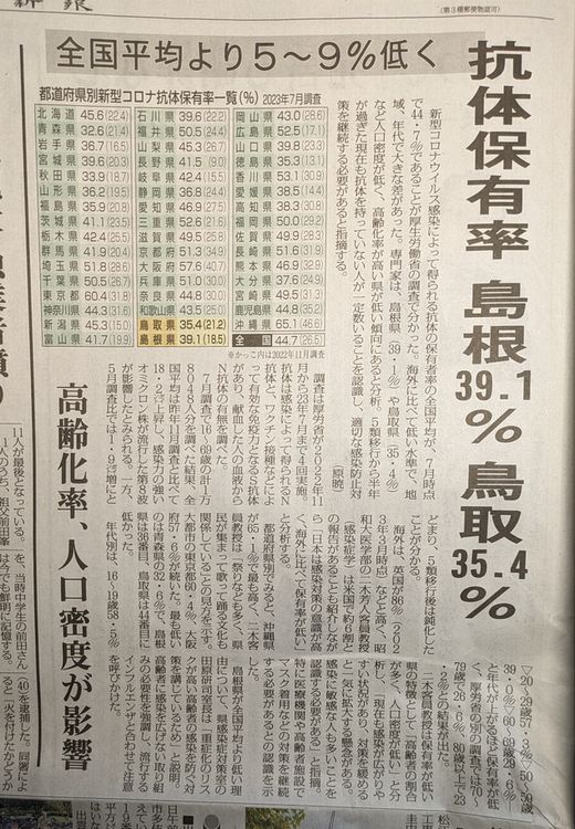 島根県、コロナ抗体保有率が39.1%だった様です。