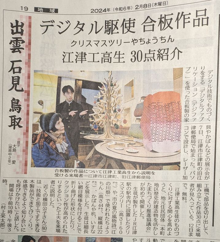 江津工業に大型レイザー加工機が昨年から導入されている様で、PCで設計した物を直接加工するデジタルファブリケーションの作品の展示です。