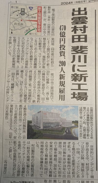 先日、出雲村田が安来に新工場との話題を取り上げましたが、更に斐川(出雲市)に新工場を建設する。と。