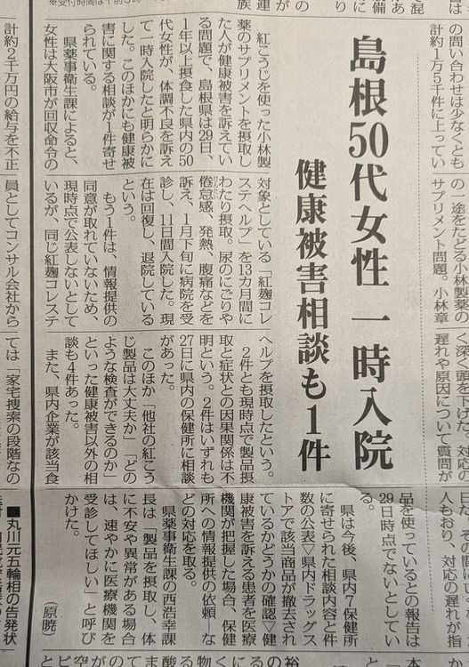 小林製薬の「 紅麹べにこうじ 」成分入りのサプリメントを摂取した人に健康被害があった問題で、島根県でもサプリを摂取し入院や被害を訴えている人がいる様です。