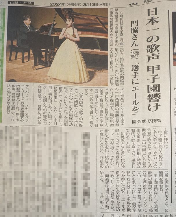 開会式では、島根県立松江北高の門脇早紀さんが君が代を独唱した。と。