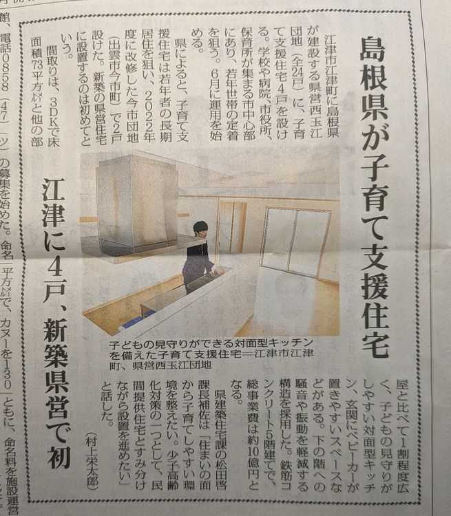 島根県が建設する経営団地に、子育て支援住宅4戸を設ける。と。