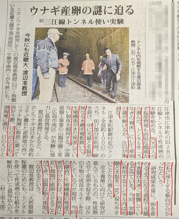 この記事によると、生殖機能が発達していない個体を飼育し、卵を産めるようになる過程で、光量や水温を一定に保てる事で、トンネル内が選ばれた様です。