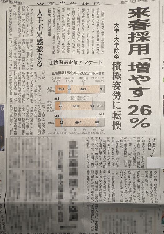 地元新聞記事に、来春の地元企業の新卒者の採用予定状況が出ていました。
