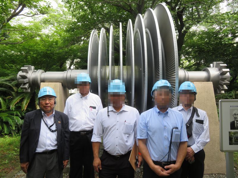 見学終了後、土光元社長が設計に携わったとされるタービンが展示されていて、その前で記念撮影。