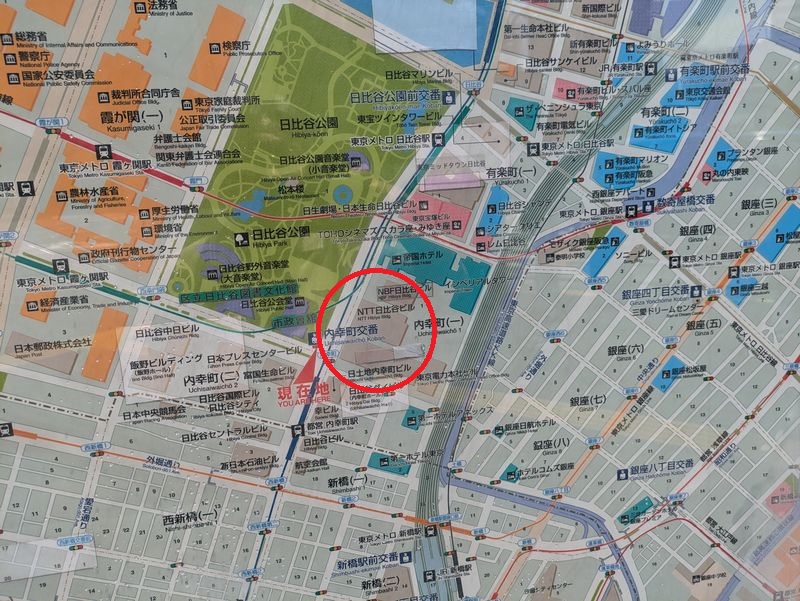 案内図があり、確認しましたが、赤丸のNBF日比谷ビル、NTT日比谷ビル、元第一勧銀ビルの3本がすべて更地になっていました。