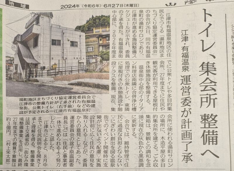 江津市の有福温泉の、公衆トイレ、集会所等の整備について「湯町地区まちづくり協定運営委員会」が了承した。と。