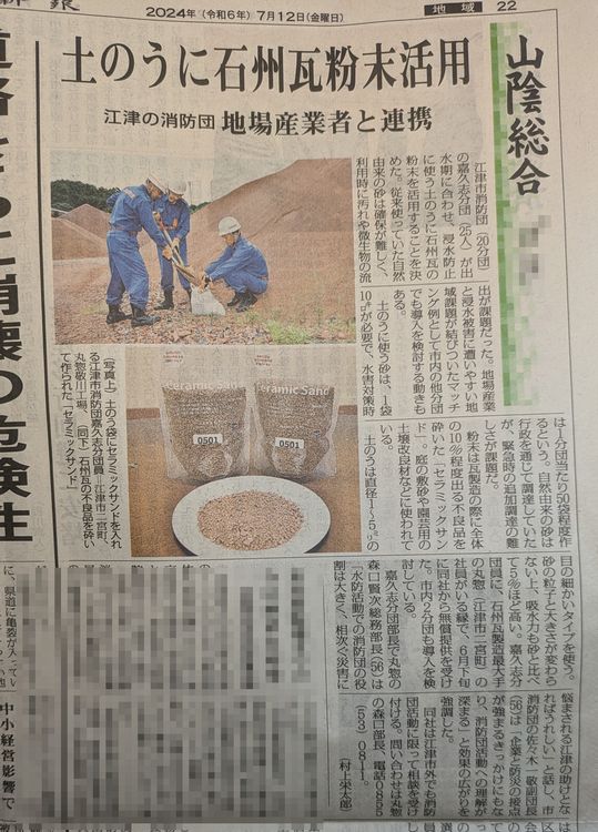 災害時に使用する土のうに石州瓦の粉末を活用するとの記事がありました。