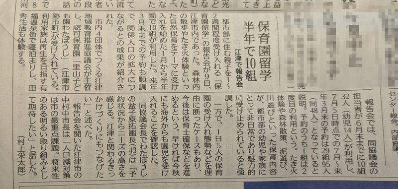 江津市で実施ている”保育園留学”が、半年で10組あった様です。