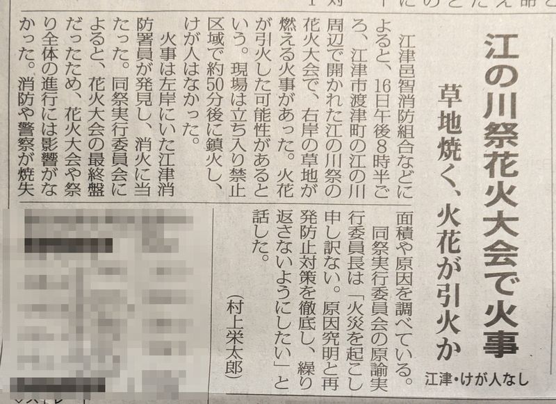 昨晩の江の川祭りの花火大会で、下草が燃える火災が発生した。と。