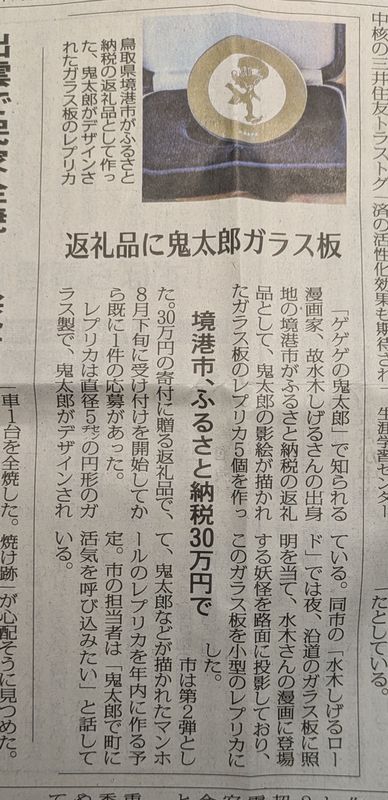 記事によると「ゲゲゲの鬼太郎」で、有名になったお隣鳥取県の境港市が、ふるさと納税品として、鬼太郎の影絵が描かれたガラス板のレプリカ5個を作った。