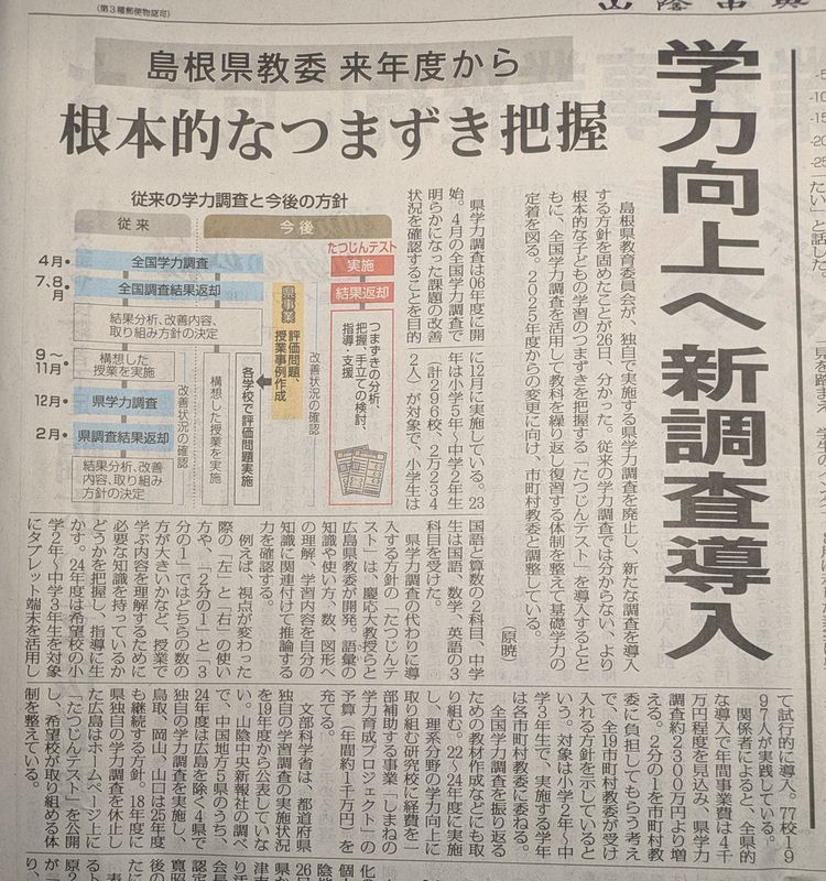 島根県は、学力向上へ向けて、新しい調査を導入する。と。