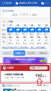 ウェザーニューズ社の予報に、1日17時~2日17時の間に190mmとポップが出ました。