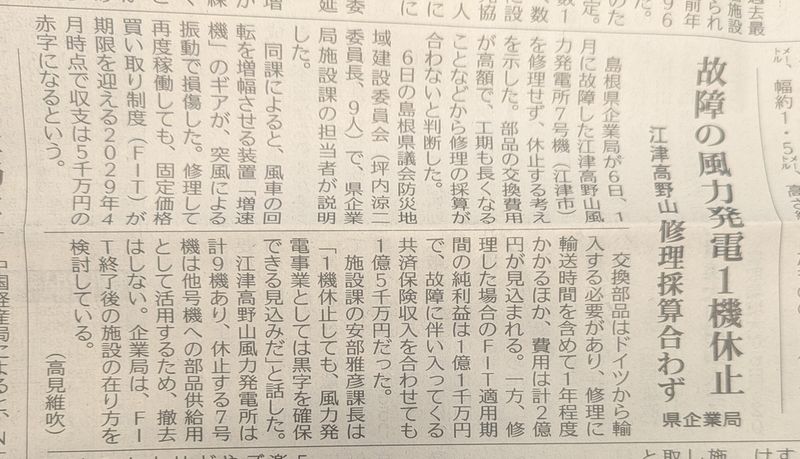 江津市にある県企業局が運営している風力発電の内1基が1月に故障したが、修理費が高く、休止する。と。