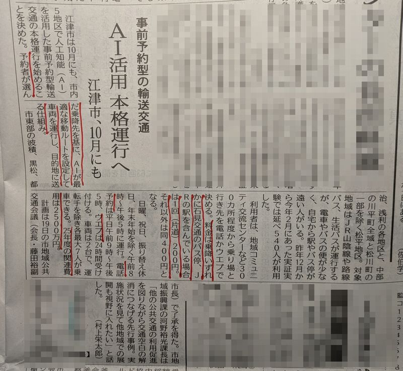 江津市は、10月にも市内5地区でAIを活用した事前予約型輸送交通の本格運行を始める事を決めた。と。