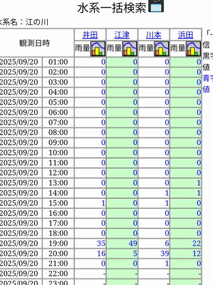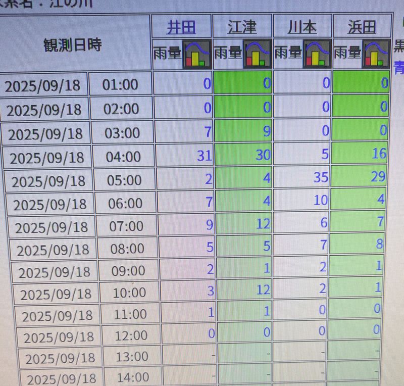 江の川水系の雨量計ですと、江津は4時のデーターが30mmで、合計78mmの雨量となった様です。