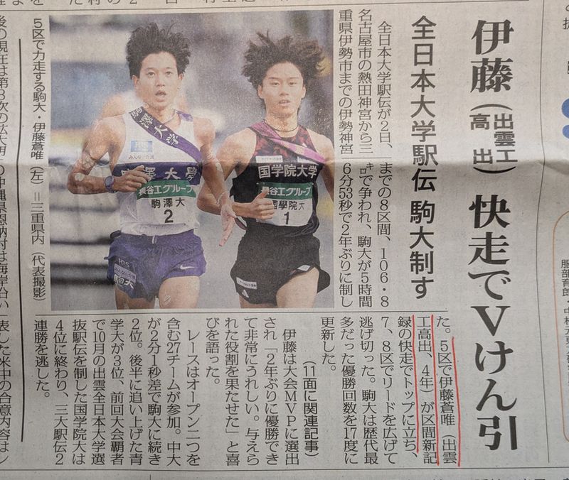 伊藤選手は、箱根駅伝等でも快走しており、取り上げたことがありましたが、出雲工業高校出身の選手です。