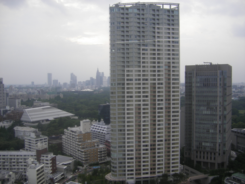 左の写真は、出来たばかりのマンション。どのくらいの値段やら?億ション?その奥に見えるビル郡は新宿