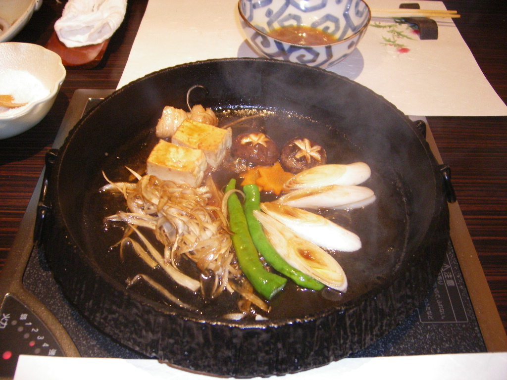前菜、お刺身(新鮮な鯛など)そしてお待ちかねのすき焼き。