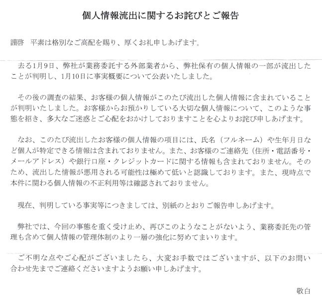 この文章からすると、委託業者が何かの失態で、個人情報が流出した様です。