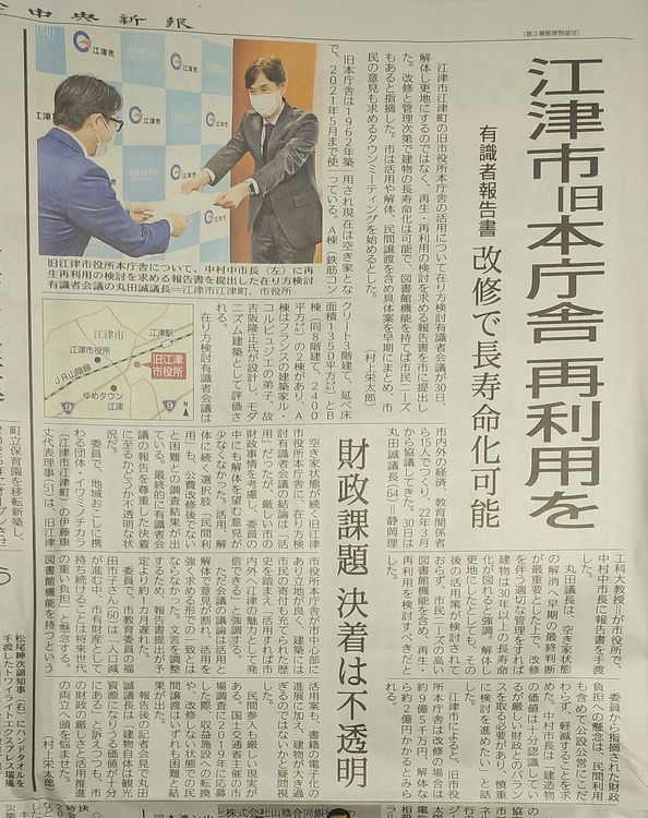 今朝の朝刊に、江津市の旧庁舎をどうするかの有識者会議の報告書を市長に提出したのと記事が・・・・。