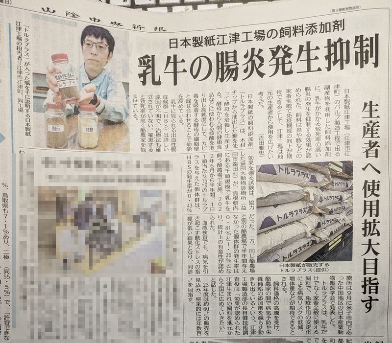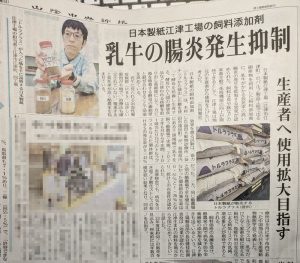 日本製紙江津工場は、パルプ製造工程で出る副産物を利用した飼料添加剤に、乳牛が掛かる致死率の高い腸炎の発生を抑制する効果が認められた。と。