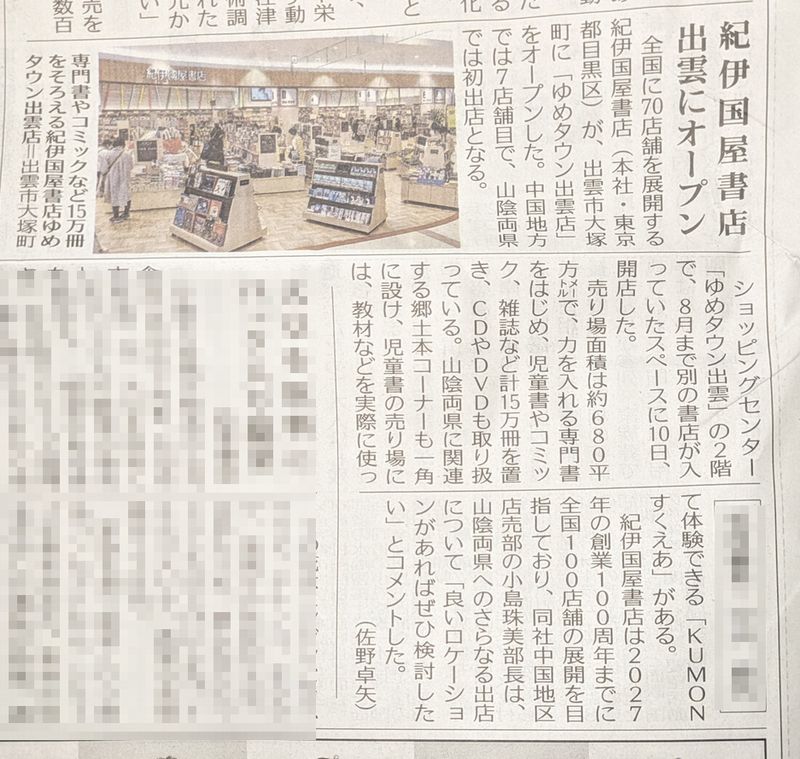 もう一つ、江津市では無いですが、大手紀伊国屋書店が、出雲に店舗を出した。と。