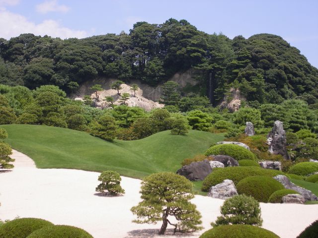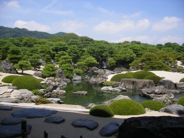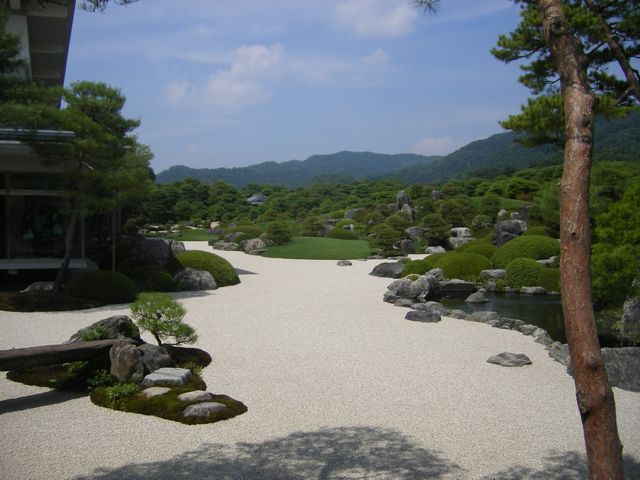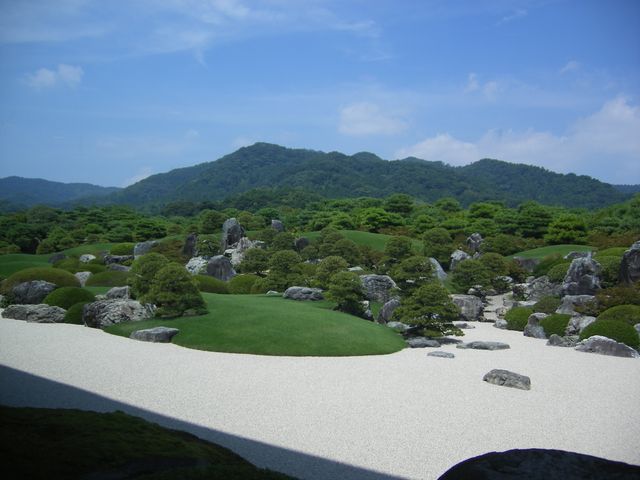 上の写真では、遠方に見える山々は、足立美術館ではないが、自然がそのままとなっていて、見事に庭に一部になって見える。